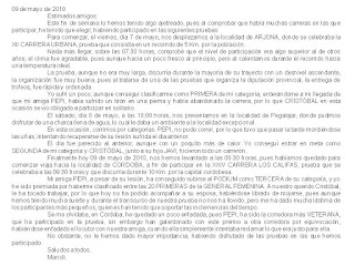 Para tu amiga Pepi, le digo: había un corredor de maratón al que su hijo le preguntó: – Vas a ganar papá. Y el padre le respondió: – Más importante que llegar primero es llegar bien. Un afectuoso saludo.